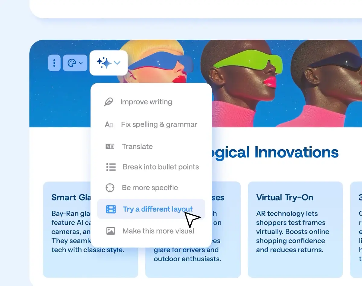 导入品牌或使用 100+ 主题,让内容自动保持一致、精美的视觉风格。