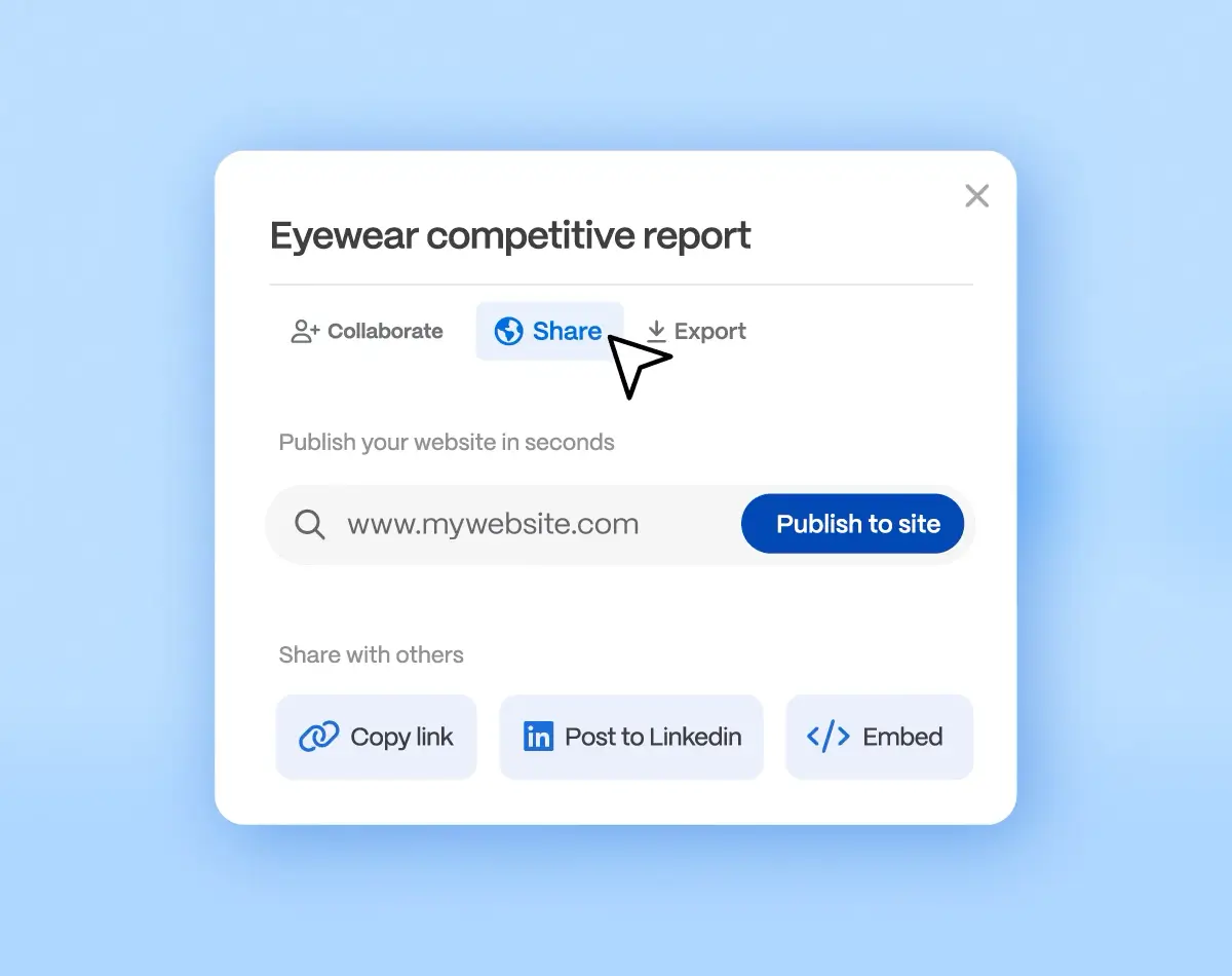 团队可实时协作编辑,完成后通过链接、网页、社交帖子或文件导出分享,并在 Pro 等高级方案中查看更详细的互动分析。